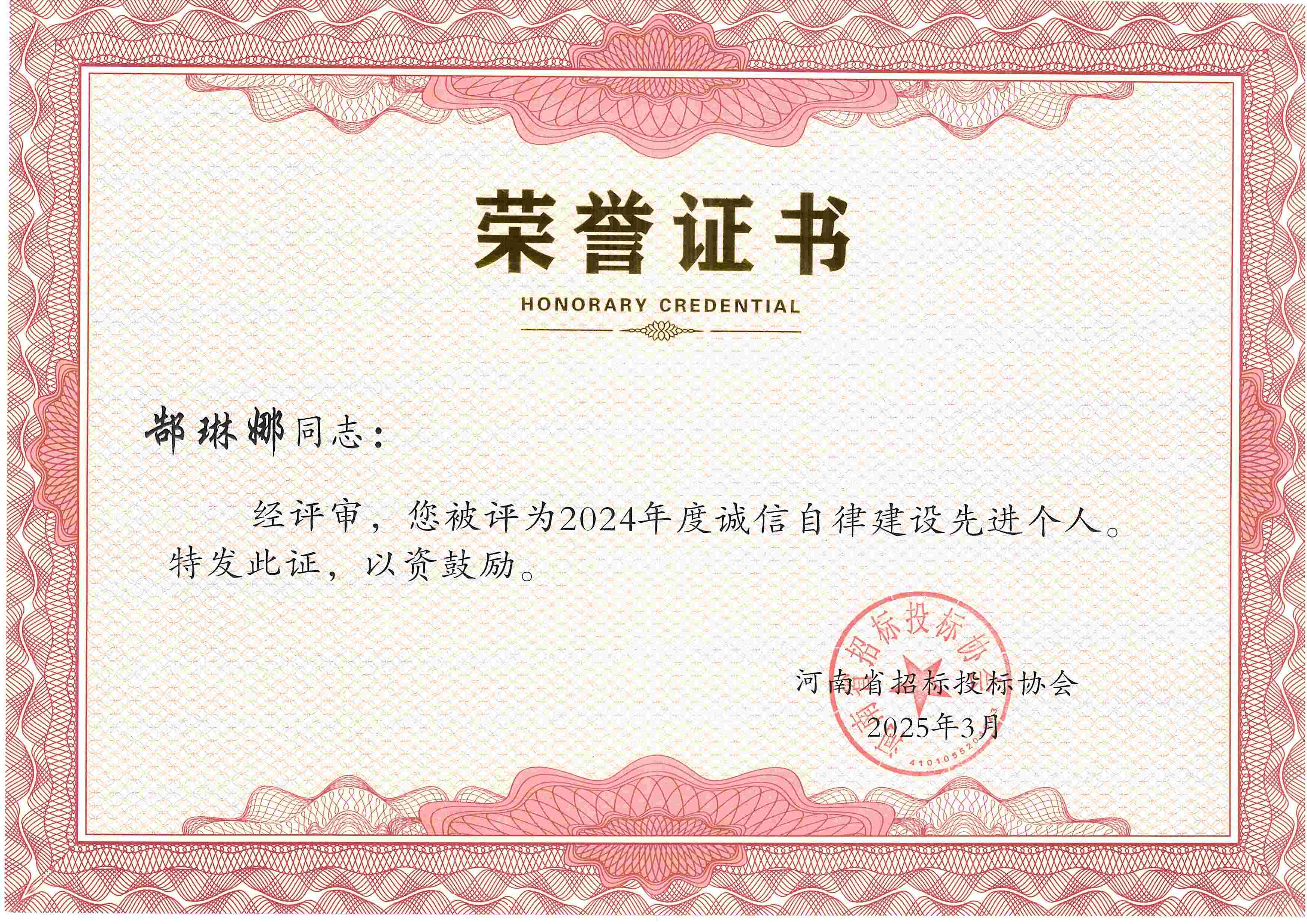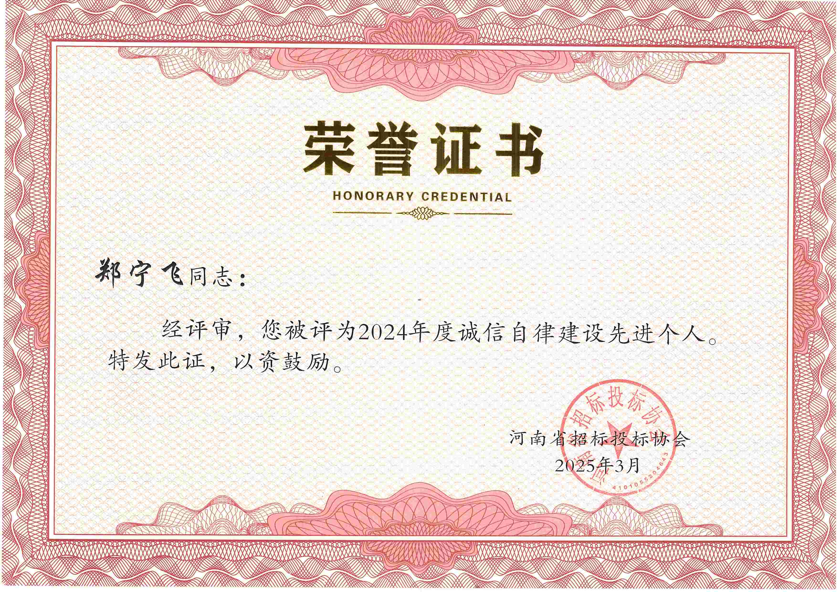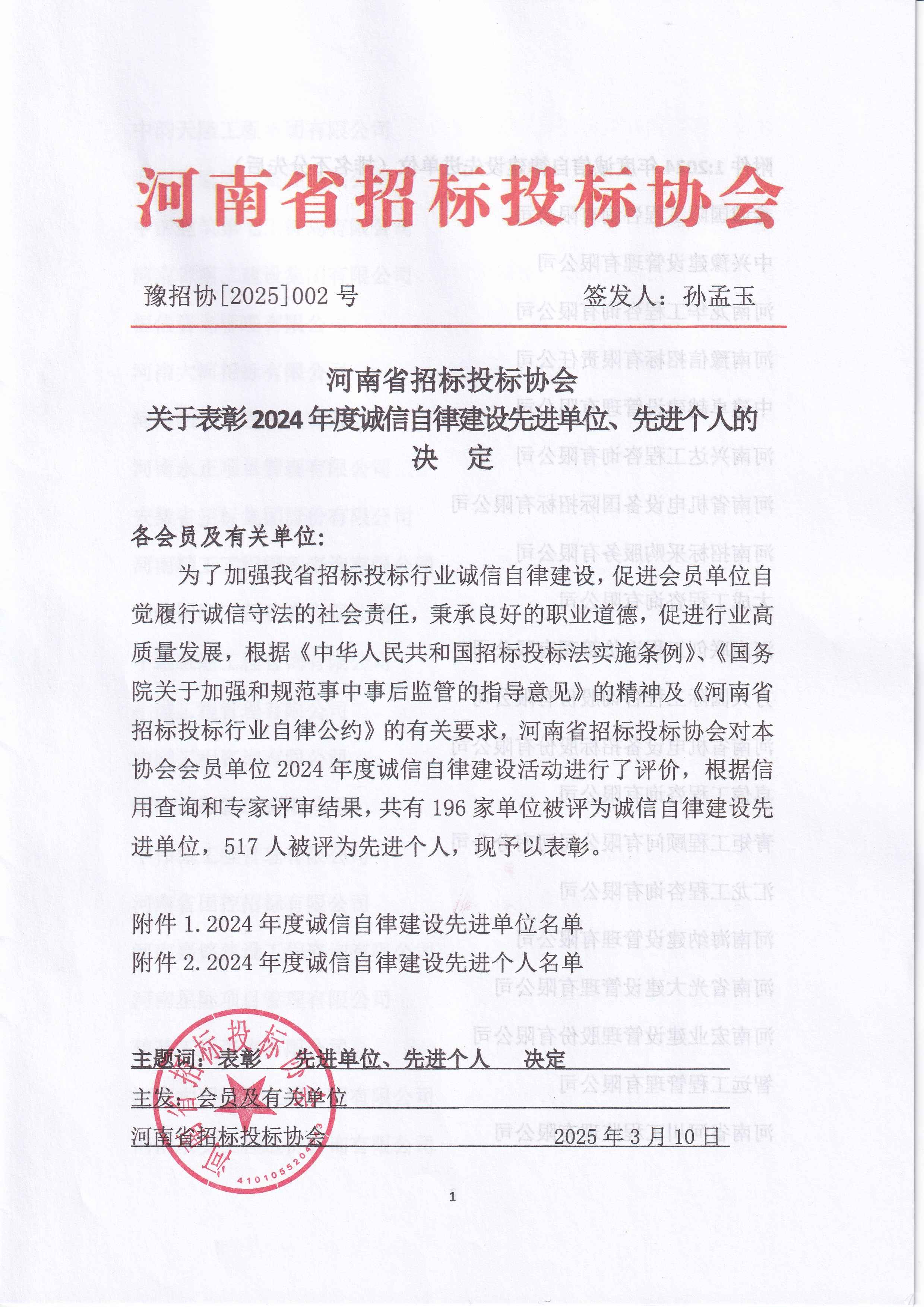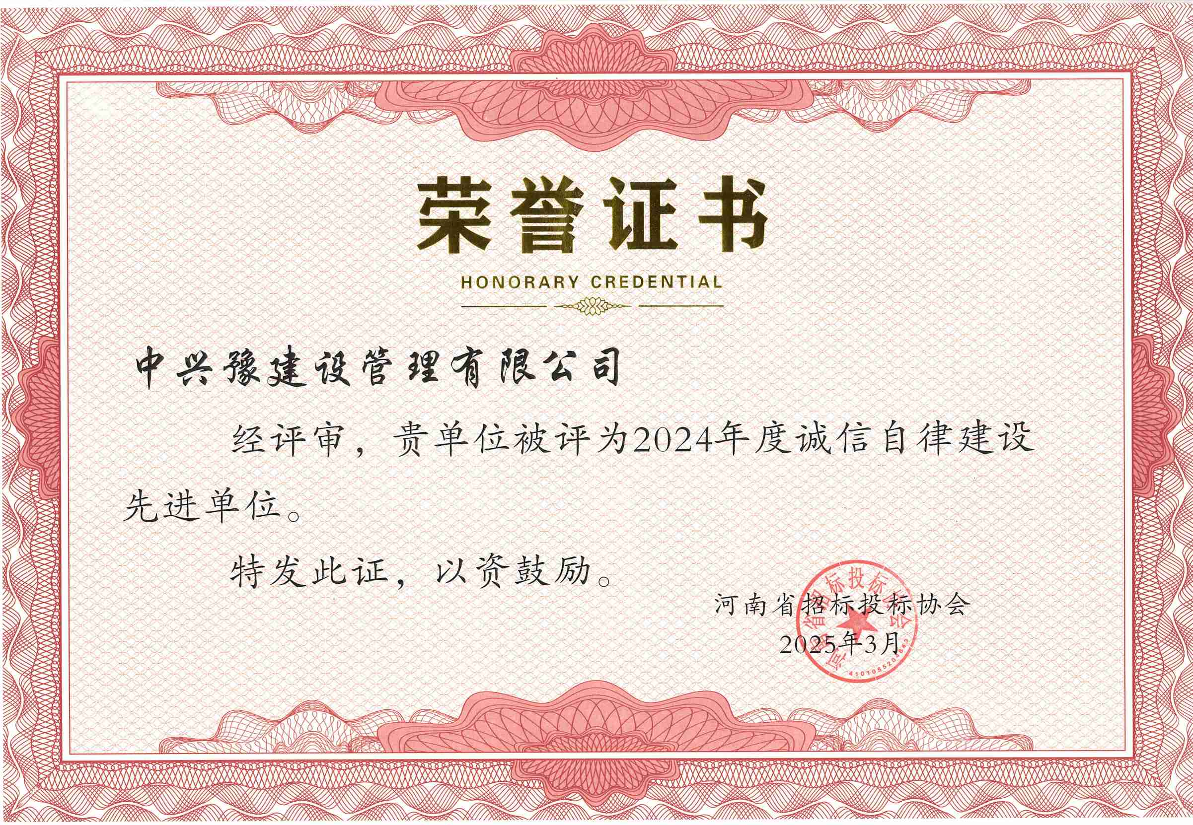 近日,河南省招標投標協(xié)會發(fā)布關(guān)于表彰2024年度誠信自律建設(shè)先進單位、先進個人的決定。其中,中興豫建設(shè)管理有限公司榮幸入選“2024年度誠信自律建設(shè)先進單位”。
