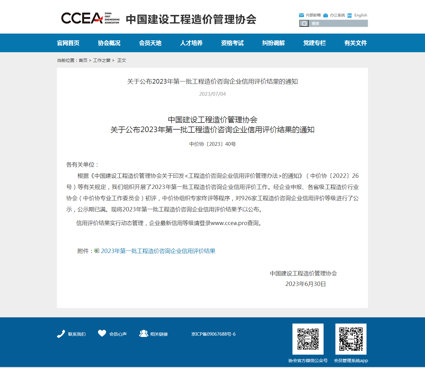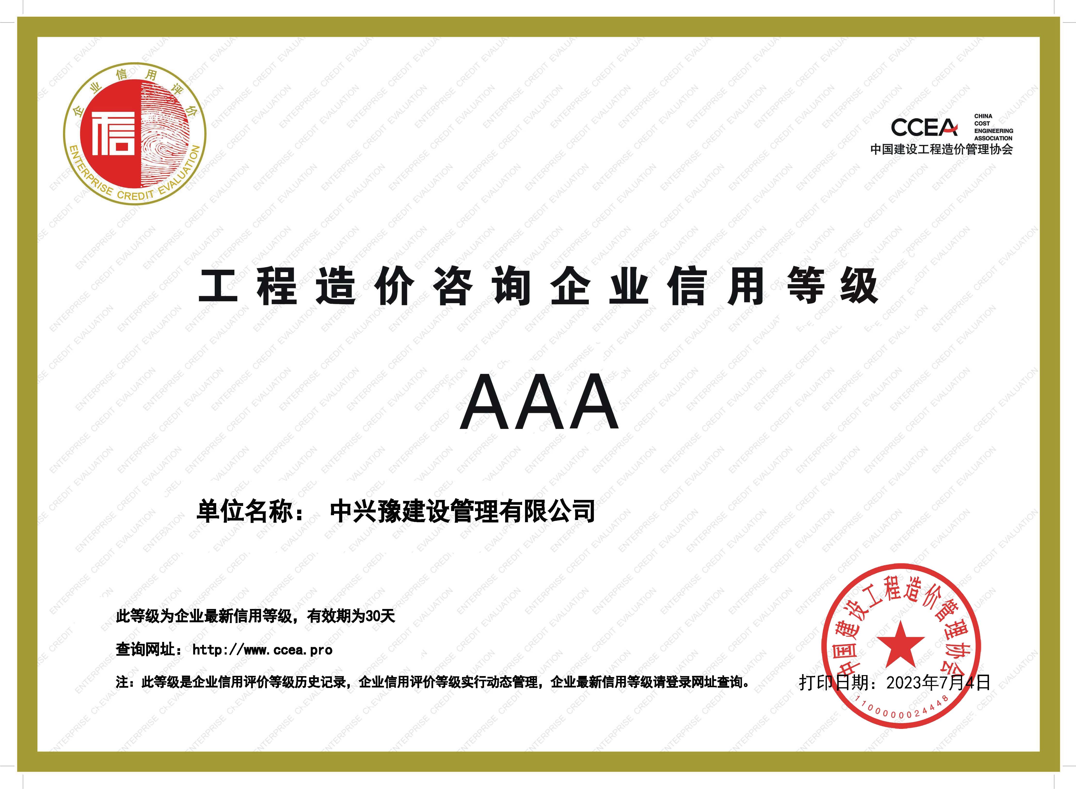 7月4日,中國(guó)建設(shè)工程造價(jià)管理協(xié)會(huì)發(fā)布關(guān)于公布2023年第一批工程造價(jià)咨詢(xún)企業(yè)信用評(píng)價(jià)結(jié)果的通知,經(jīng)企業(yè)申報(bào)、各省級(jí)工程造價(jià)行業(yè)協(xié)會(huì)初評(píng),中價(jià)協(xié)組織專(zhuān)家終評(píng)等程序,中興豫建設(shè)管理有限公司榮獲中國(guó)建設(shè)工程造價(jià)管理協(xié)會(huì)信用評(píng)價(jià)AAA級(jí)!