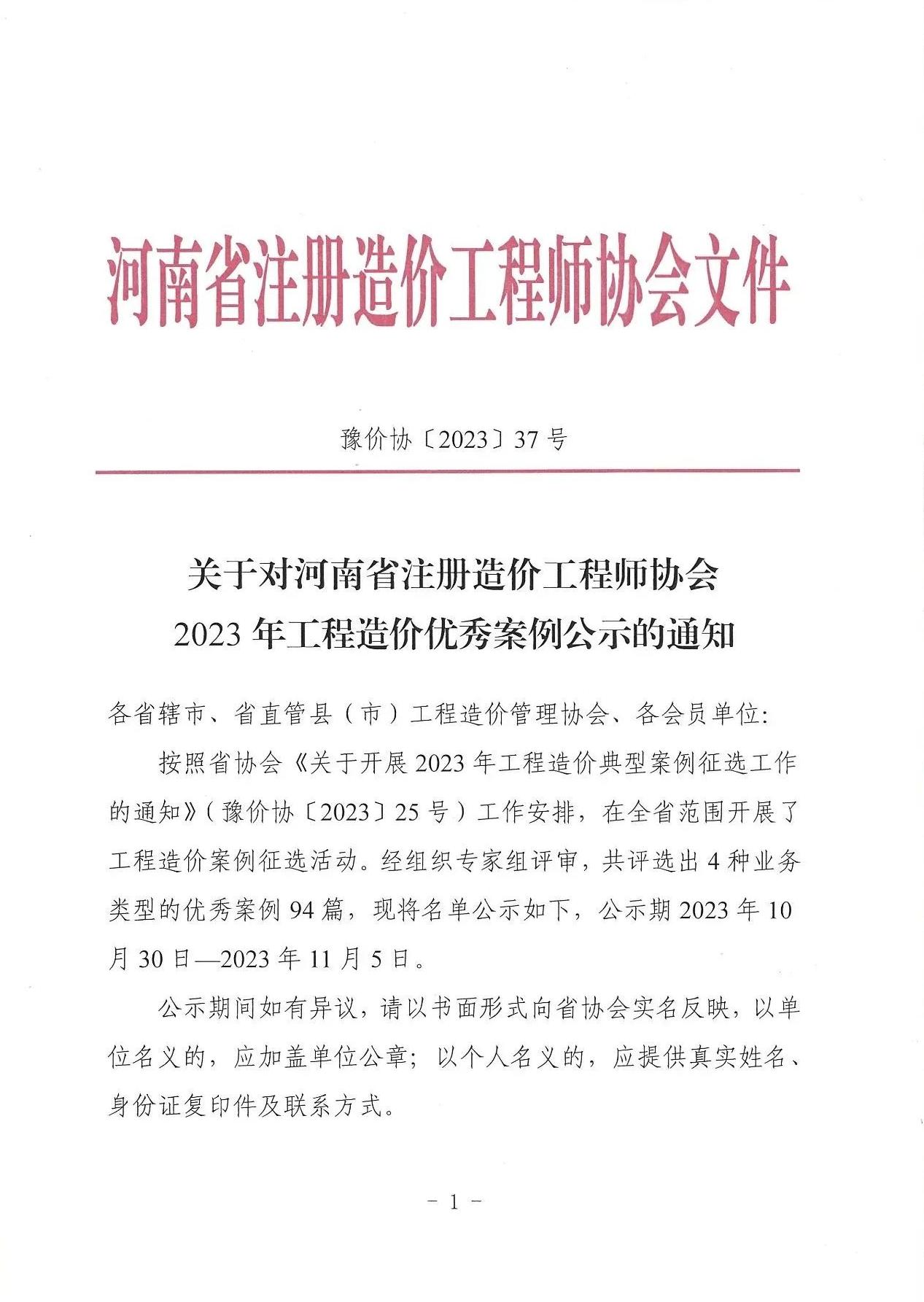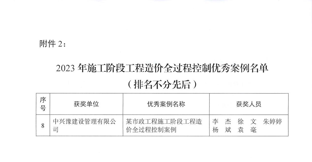 喜報|中興豫建設管理有限公司榮獲“河南省注冊造價工程師協(xié)會2023年工程造價優(yōu)秀案例”榮譽稱號