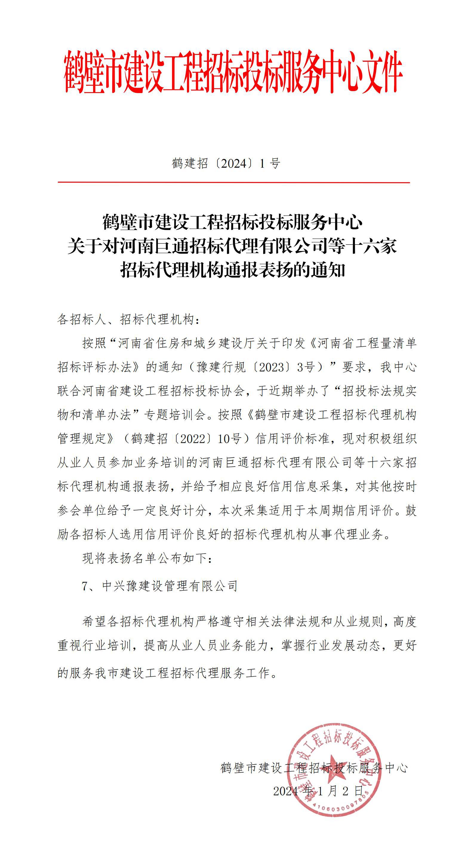 近日,鶴壁市建設(shè)工程招標(biāo)投標(biāo)服務(wù)中心發(fā)布了《關(guān)于對河南巨通招標(biāo)代理有限公司等十六家招標(biāo)代理機(jī)構(gòu)通報表揚(yáng)的通知》,對積極組織從業(yè)人員參加業(yè)務(wù)培訓(xùn)的代理機(jī)構(gòu)通報表揚(yáng),中興豫建設(shè)管理有限公司榜上有名,同時鼓勵各招標(biāo)人選用信用評價良好的招標(biāo)代理機(jī)構(gòu)從事代理業(yè)務(wù)。