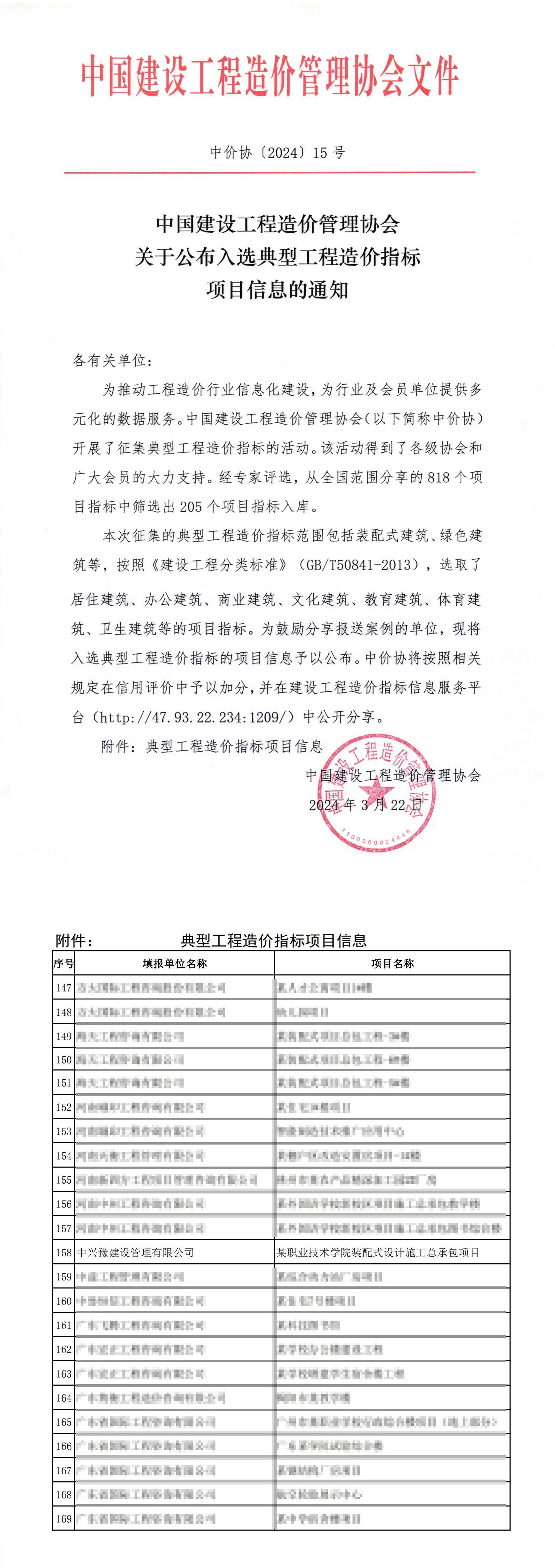 近日,中國(guó)建設(shè)工程造價(jià)管理協(xié)會(huì)關(guān)于公布入選典型工程造價(jià)指標(biāo)項(xiàng)目信息的通知中,我公司的“某職業(yè)技術(shù)學(xué)院裝配式設(shè)計(jì)施工總承包項(xiàng)目"作為典型項(xiàng)目入選其中。