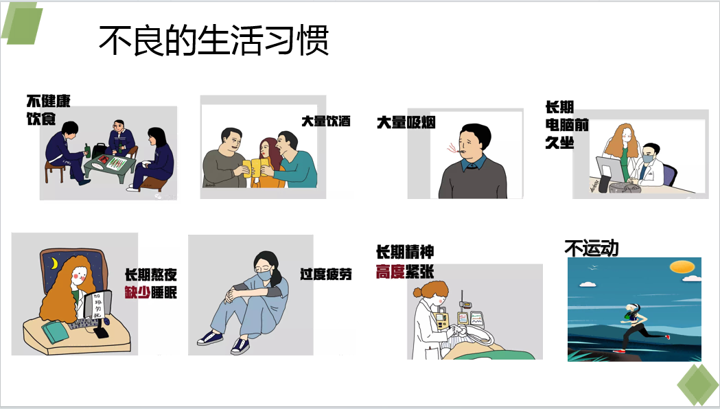 由于現(xiàn)今社會工作壓力大,生活節(jié)奏快等原因,人們在生活中存在以下不良生活習(xí)慣:不健康飲食、大量飲酒、大量吸煙、長期電腦前久坐、長期熬夜缺少睡眠、過度疲勞、長期精神高度緊張、缺乏運動等。這些不良生活習(xí)慣會導(dǎo)致人們的身體長期處于“亞健康”狀態(tài),從而誘發(fā)一些慢性疾病?,F(xiàn)今“三高”等慢性疾病呈年輕化趨勢,與這些不良生活習(xí)慣脫不了干系。