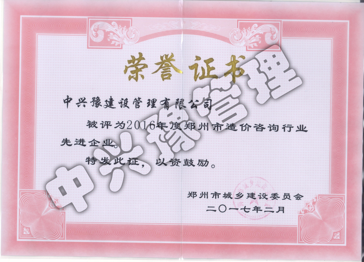 2016年度工程造價(jià)先進(jìn)企業(yè)-公司榮譽(yù)