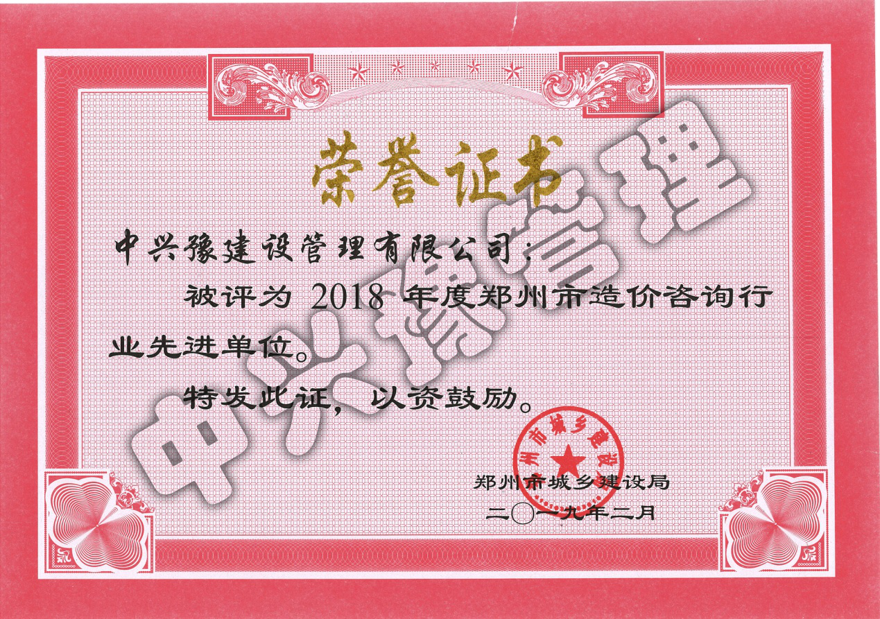 2018年度鄭州市造價咨詢行業(yè)先進(jìn)單位榮譽(yù)證書-公司榮譽(yù)