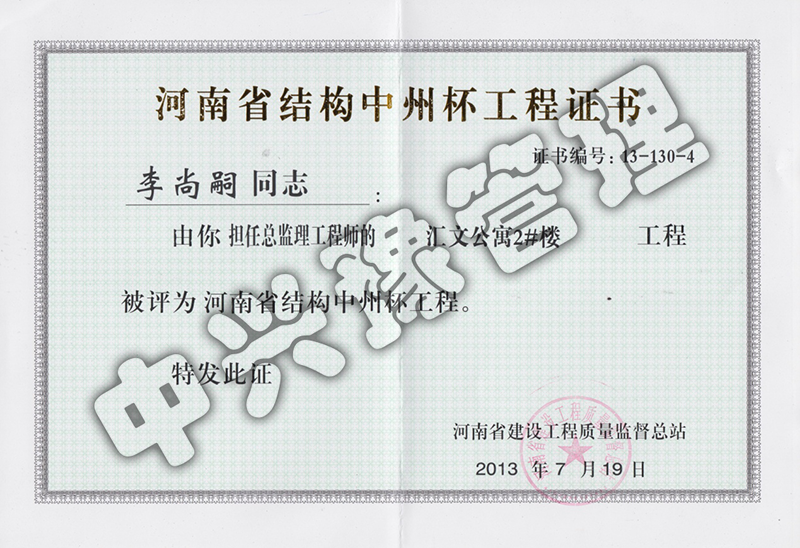 2013年匯文公寓結(jié)構(gòu)中州杯-獲獎(jiǎng)項(xiàng)目